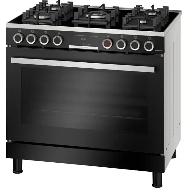 بوش بوتجاز ، مقاس 90 سم ، 5 شعلة ، شاشة ديجيتال ، امان تام ، حوامل زهر ، مروحه فرن ، أسود ، HJY5G7V61S